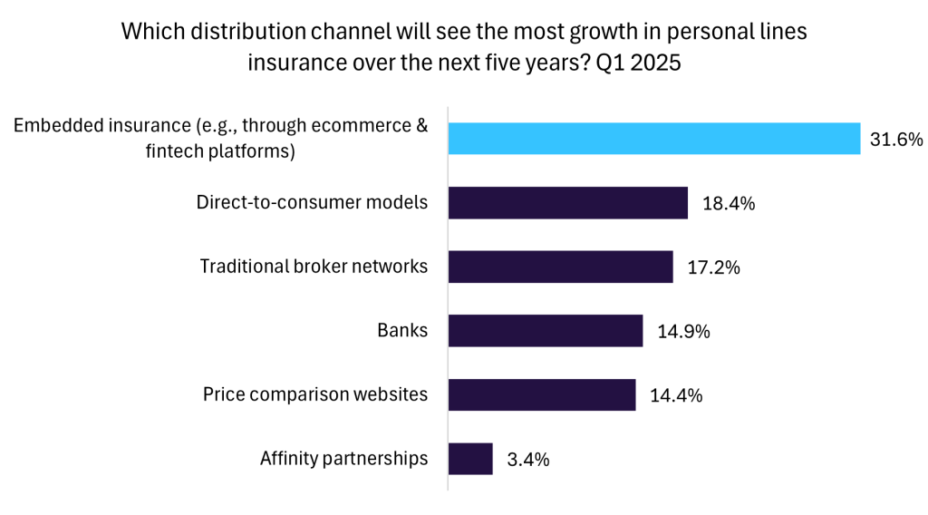 The poll, conducted in Q1 2025 among industry professionals, found that 31.6% expect embedded insurance to see the most growth in personal lines, outpacing direct to consumer models (18.4%), traditional broker networks (17.2%), banks (14.9%), price comparison websites (14.4%), and affinity partnerships (3.4%). That margin indicates a meaningful shift in distribution channels and consumer expectations toward seamless, contextual purchasing.