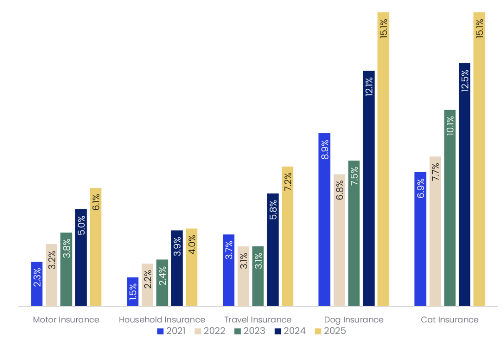Travel insurance purchases via apps climbed from 3.7% to 7.2%, and pet insurance shows particular strong adoption, with dog insurance rising from 8.9% to 15.1% and cat insurance from 6.9% to 15.1%. These trends suggest that while overall penetration remains modest in some lines, consumer willingness to transact insurance digitally is strengthening.